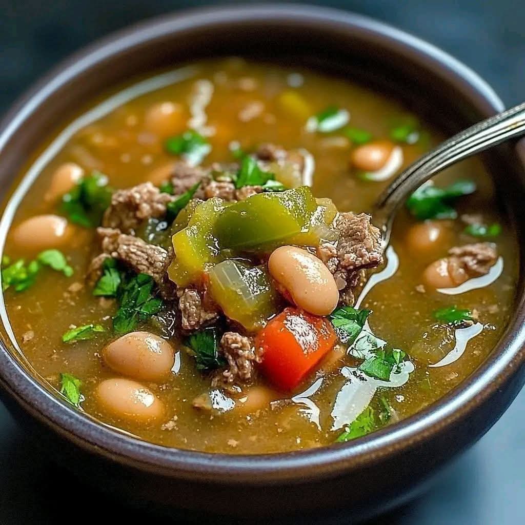 Add beans, green chiles, beef broth, cumin, salt, and pepper.