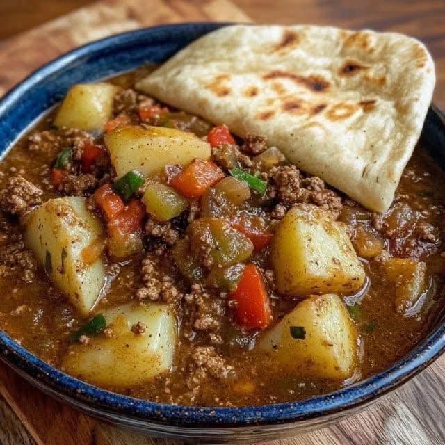 Add the evoo to a skillet add potatoes cook until browned and cooked through, remove from pan. Add ground beef, garlic and onions and spices cook until browned add tomatoes and Serrano cook until thick add potatoes and simmer 5 minutes and done!