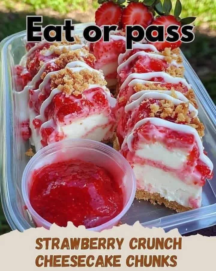 Strawberry Crunch Cheesecake Chunks are a delightful twist on classic cheesecake, combining creamy richness with a sweet, crunchy strawberry topping.